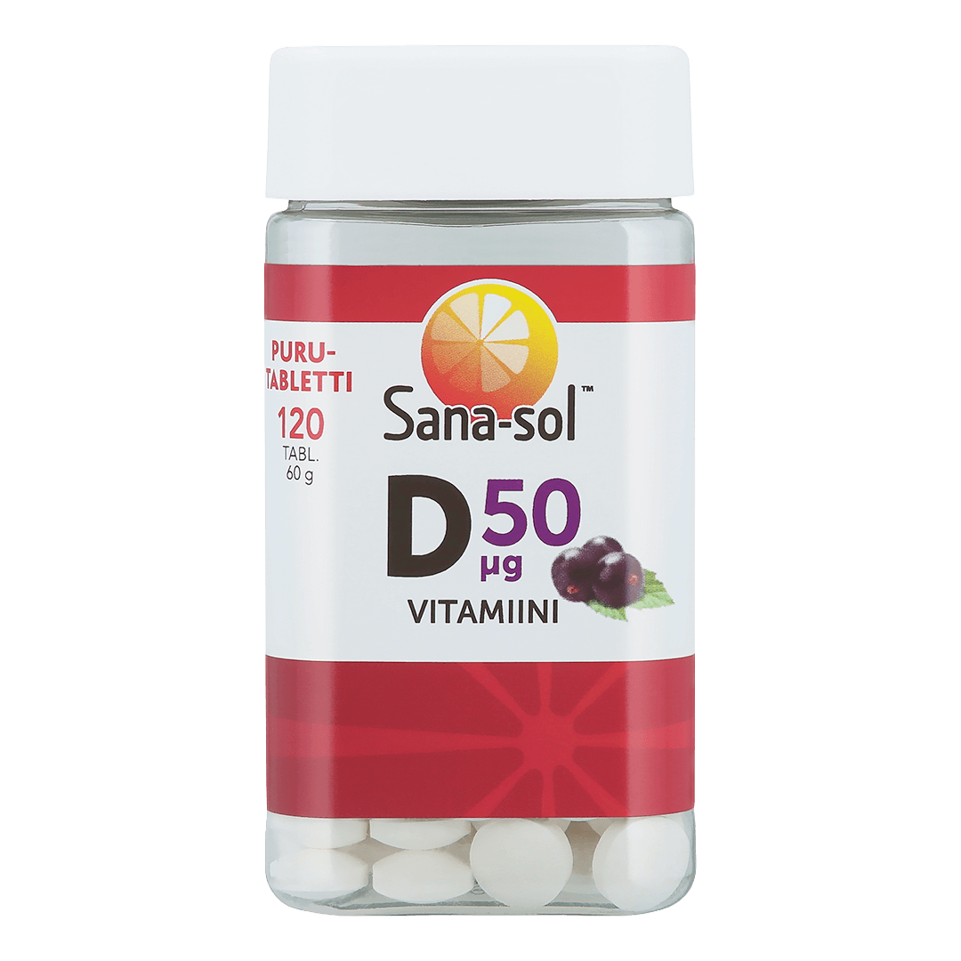 Mustaherukanmakuinen D-vitamiinipurutabletti. Ravintolisä.